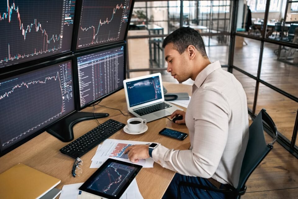 An investor looks at data on several different monitors.