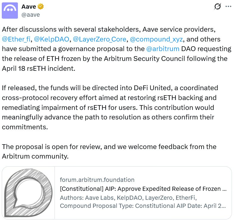 Aave Labs has proposed that the decentralized autonomous group behind Arbitrum unfreeze $73.5 million in Ether tied to the Kelp DAO assault and to direct these funds to “DeFi United,” a fund aimed toward restoring rsETH and compensating its holders.