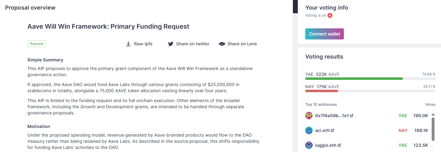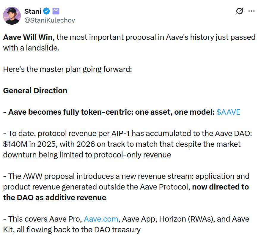 Following the vote, Aave founder Stani Kulechov said in an X submit Saturday that Aave Will Win is the “most necessary proposal in Aave’s historical past” and it “simply handed with a landslide.”