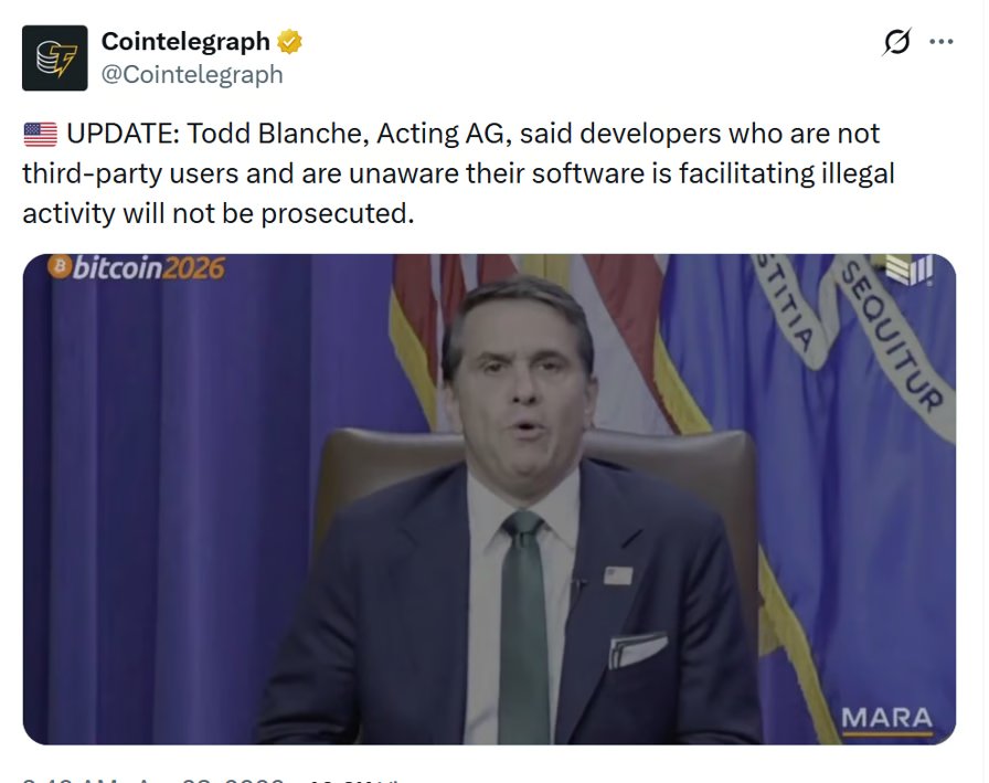 Appearing US Legal professional Basic Todd Blanche stated the US Division of Justice and FBI are now not focusing on blockchain builders over platforms used for criminality, as a substitute shifting focus to the customers engaged in monetary crime.