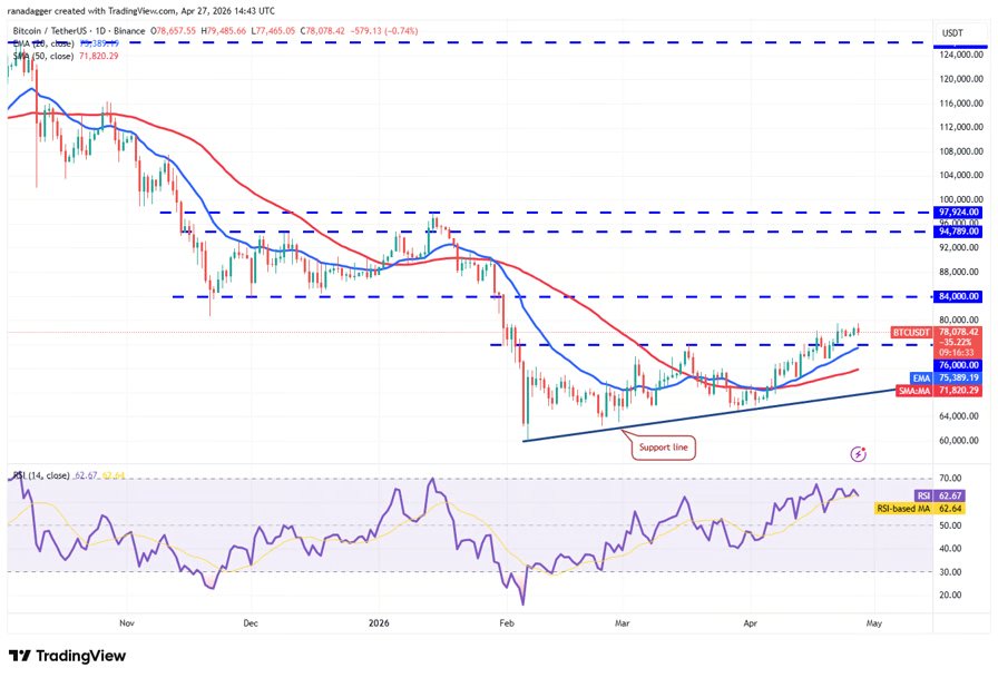- Bitcoin continues to face resistance close to $79,500, however the trajectory stays up so long as the value holds above $76,000.