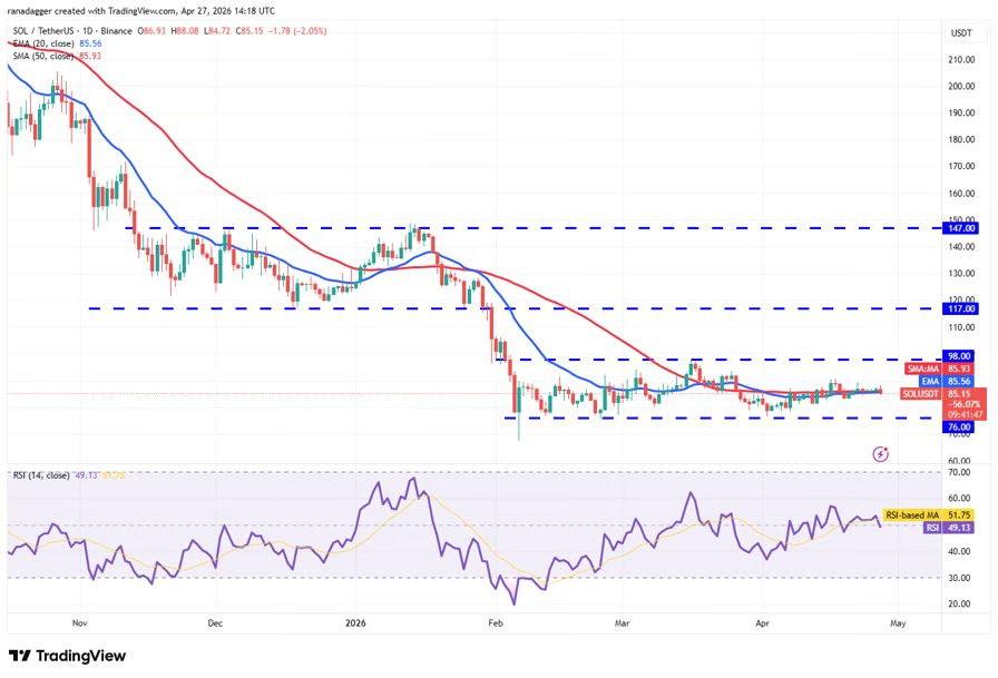 Solana (SOL) continues to commerce close to the transferring averages, indicating a steadiness between provide and demand.
