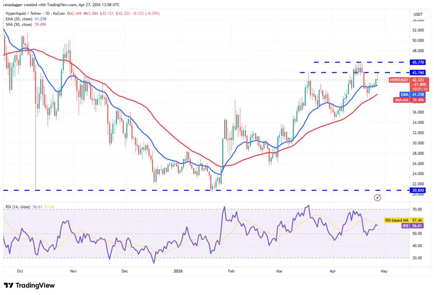 The uptrend is going through promoting strain within the $43.76 to $45.77 zone, as seen within the lengthy wick on the candlestick. Sellers will try to sink the HYPE worth under the 20-day EMA ($41.25), opening the door to a drop towards the 50-day SMA ($39.50).
