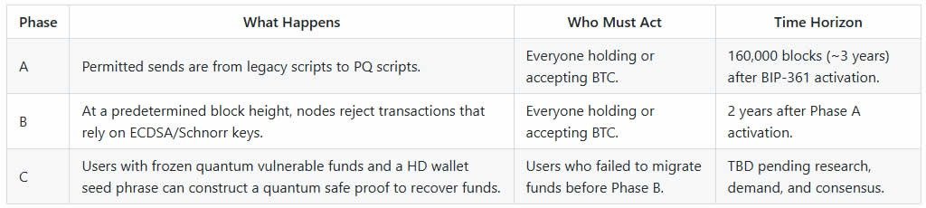 BIP-361 proposes that three years after activation, section A of the proposal would forestall any new BTC from being despatched to old-style addresses, with all customers on quantum-resistant handle varieties.