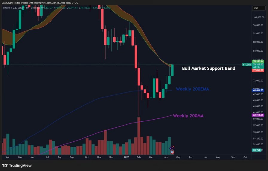 “$BTC Making an attempt to interrupt again above the bull market help band,” dealer Daan Crypto Trades confirmed.