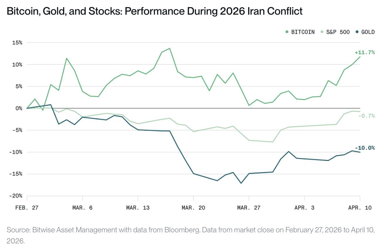 “Since U.S. and Israeli airstrikes started on February 28, bitcoin is up 12% whereas the S&P 500 is down 1% and gold has fallen 10%.”