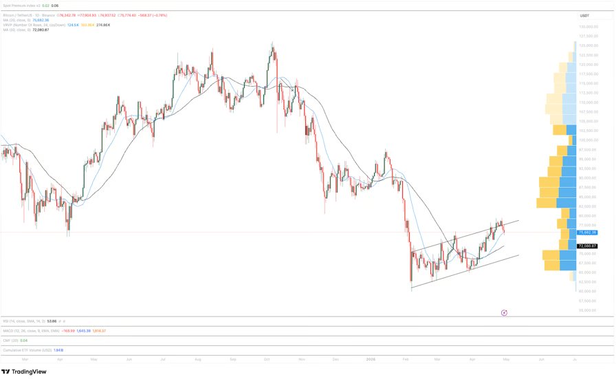 As reported on Monday by Cointelegraph, following the break above the channel resistance on the each day chart, BTC required consecutive each day candle closes above the trendline, adopted by a decrease assist restest within the $76,500 to $75,500 vary.