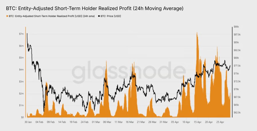 BTC entity-adjusted short-term holder realized revenue. Supply: Glassnode