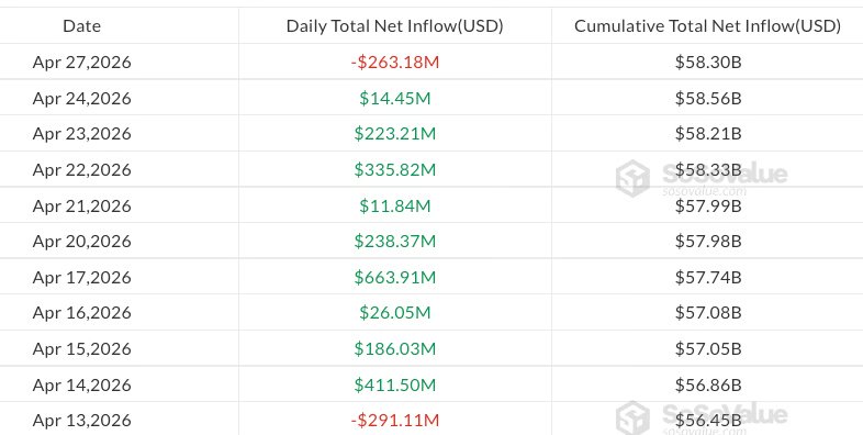 Day by day spot Bitcoin ETF inflows from April 13, 2026. Supply: SoSoValue