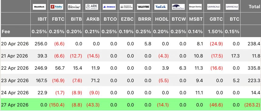 Bitcoin ETFs noticed $263 million in web outflows on Monday, marking the primary outflows since mid-April, according to SoSoValue information.