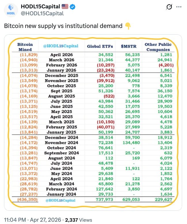 Bitcoin’s rally in April got here as institutional demand far outpaced mining provide.