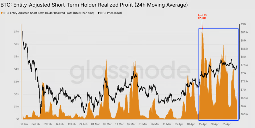 The metric spiked as excessive as $7.2 million per hour on April 15, about roughly “4 occasions the bottom stage that had established itself since mid-April, confirming that short-term holders seized the rally as a distribution alternative,” Glassnode mentioned, including: