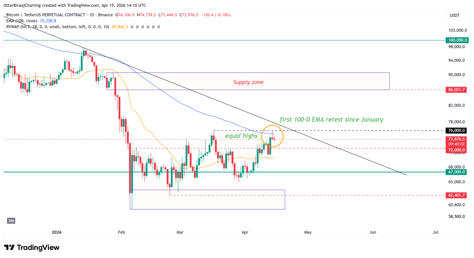 After forming equal highs close to $76,000, BTC’s worth rejected close to the 100-day exponential transferring common (EMA), marking the primary take a look at of this pattern since Jan. 14. The momentum slowed after the rejection, with worth slipping to $73,500.