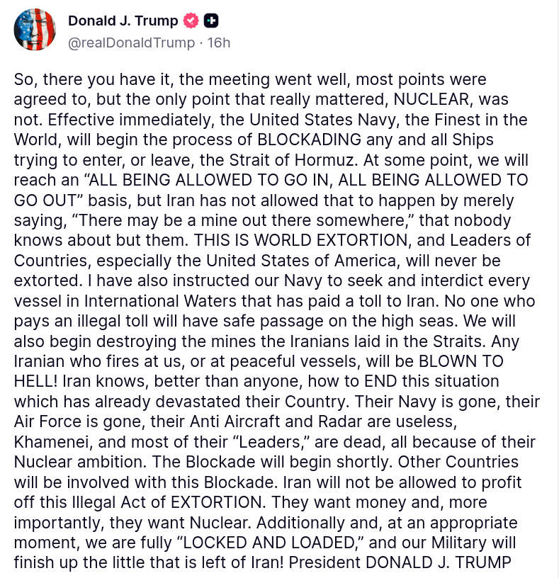 “It seems that Trump’s long-term plan is to blockade Hormuz, acquire management, then start letting site visitors movement freely,” buying and selling useful resource The Kobeissi Letter commented in a response on X.