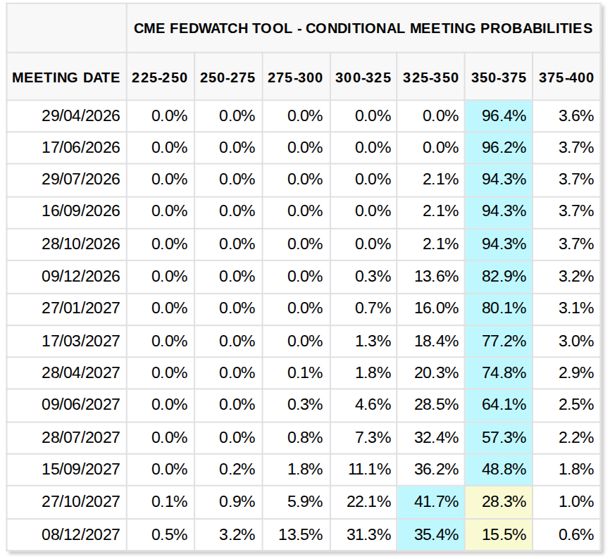 The newest information from CME Group’s FedWatch Tool exhibits that markets already see no fee cuts coming earlier than the second half of 2027.