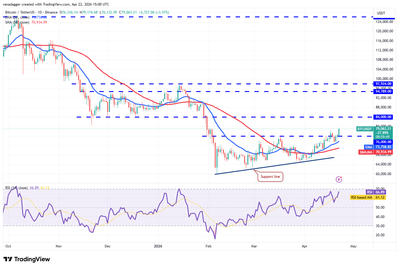 BTC turned up from the 20-day exponential shifting common ($73,758) on Monday and rose above the $78,333 degree on Wednesday, indicating a bonus to the bulls.