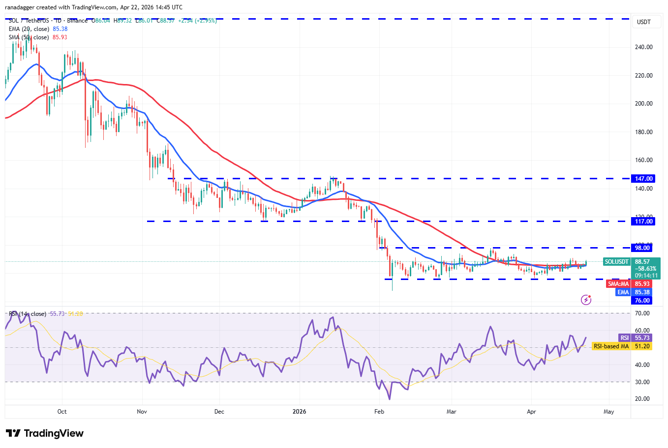 If the value rises above $91, the SOL/USDT pair could climb to the overhead resistance at $98. Sellers are anticipated to fiercely defend the $98 degree, but when the bulls prevail, the uptrend could attain $117.