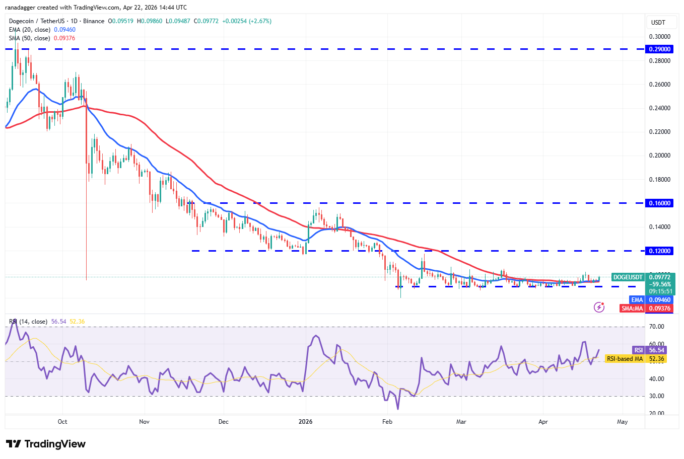 Time is operating out for the bears. They must swiftly pull the value again beneath the $0.09 degree to retain the benefit. In the event that they try this, the DOGE/USDT pair could stoop to the Feb. 6 low of $0.08.