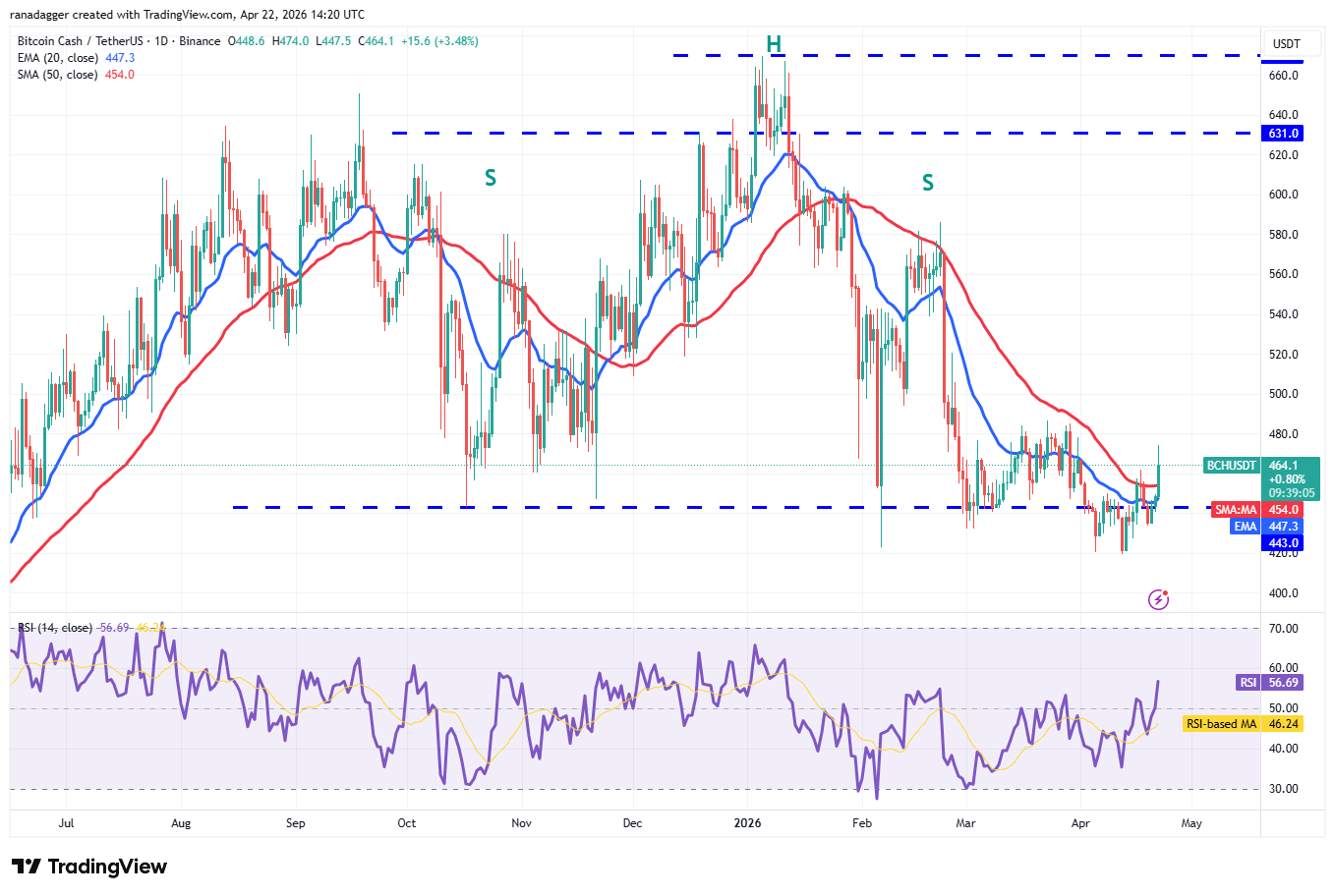 Bitcoin Money (BCH) has damaged above the 50-day SMA ($454), indicating strong demand at decrease ranges.