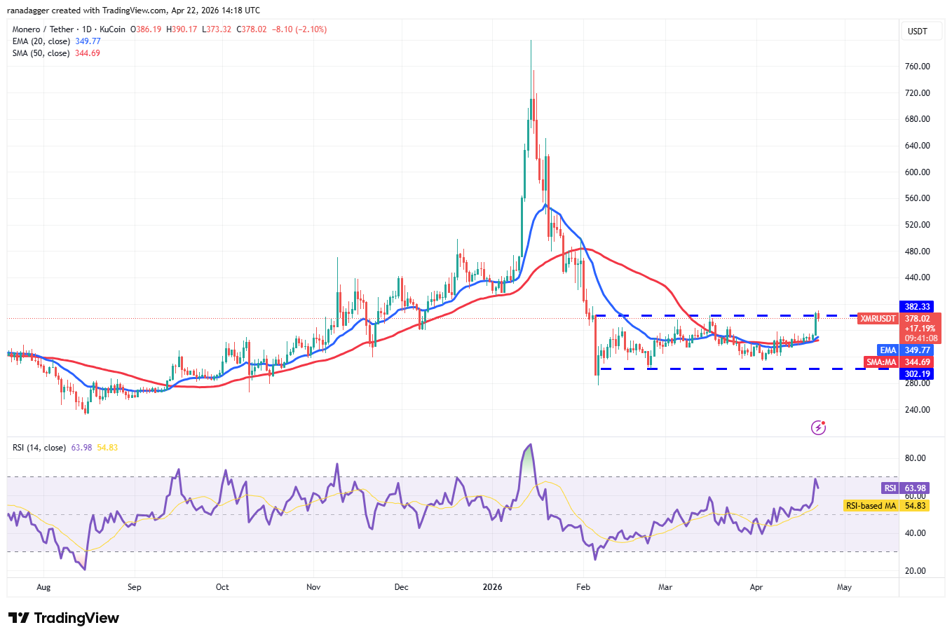 Opposite to this assumption, if the XMR worth closes beneath $382, it means that the bears are promoting on rallies. The pair could then pull again to the shifting averages, that are prone to act as robust help. If the value rebounds off the shifting averages, the bulls will once more try to provoke the uptrend.