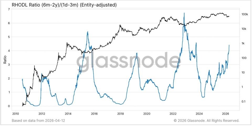The RHODL ratio, by Glass nodea key on-chain metric monitoring the stability between long-term and short-term bitcoin holders, is flashing indicators extra according to a market backside than a cycle prime, after hitting a ratio of 4.5.