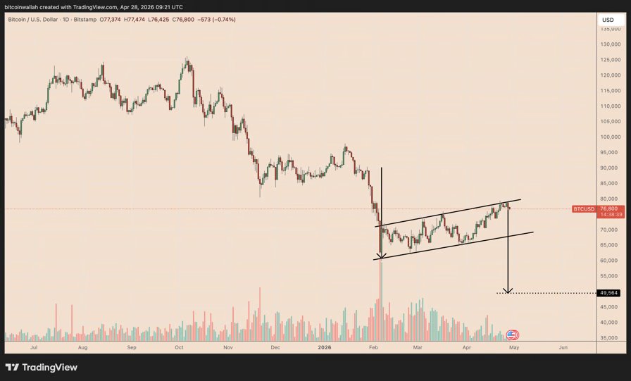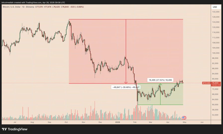 Now, in late April 2026 (over 24 months post-halving), BTC trades round $77,000, down 38%–40% from that peak. This alignment suggests the 2025 excessive might characterize the cycle prime, casting doubt on new highs for the rest of 2026.