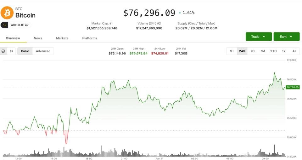 The crypto market is exhibiting indicators of energy on Tuesday with bitcoin rising to $76,500, a acquire of about 1% since midnight UTC.