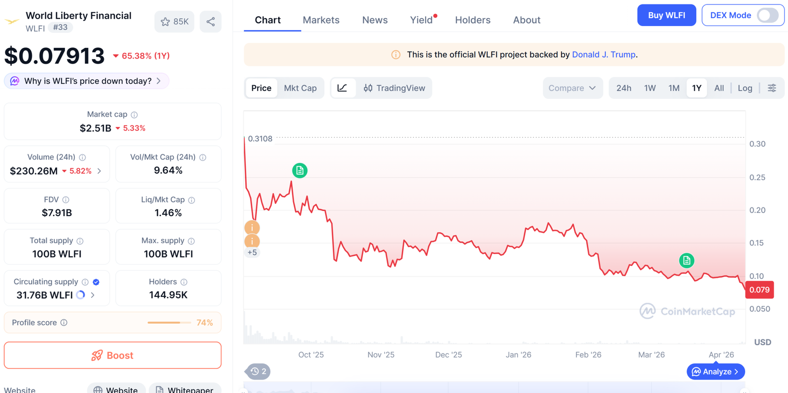 The token hit a brand new low of round $0.07714 on Saturday, down 83% from its peak of $0.46 reached final September, according to knowledge from CoinMarketCap. WLFI is at the moment at $0.07879, down by 4.66% over the previous day.