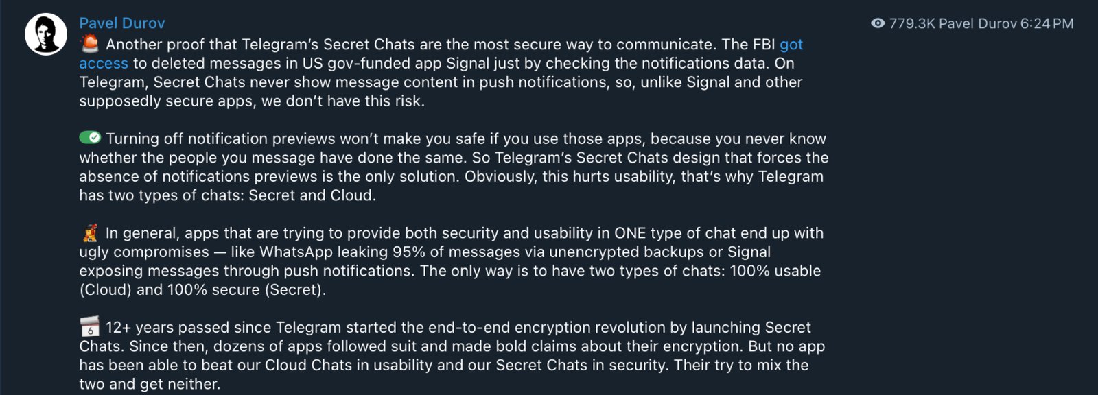 Durov cited just lately reports that forensic analysts on the US Federal Bureau of Investigation (FBI) have been capable of retrieve messages despatched on the privacy-preserving messaging software Sign by accessing push notification system logs on an Apple iPhone. Durov said: