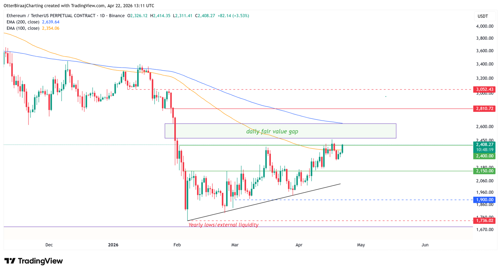 Ether can also be making an attempt to reclaim the 100-day exponential shifting common (EMA), a degree related to trend-continuation phases. The steadiness above this pattern would reinforce the upward rally. The 200-day EMA is drifting towards the higher finish of the imbalance zone close to $2,634, making a technical overlap with liquidity.
