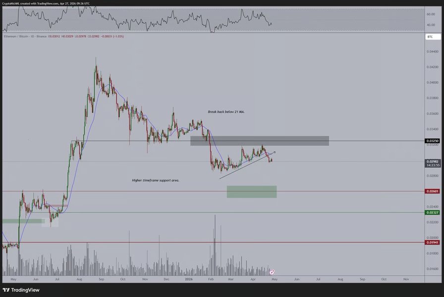 MN Capital founder Michaël van de Poppe noted weak spot within the ETH/BTC pair. The ratio dropped under 0.032 BTC, eradicating a key help stage tied to prior continuation makes an attempt.