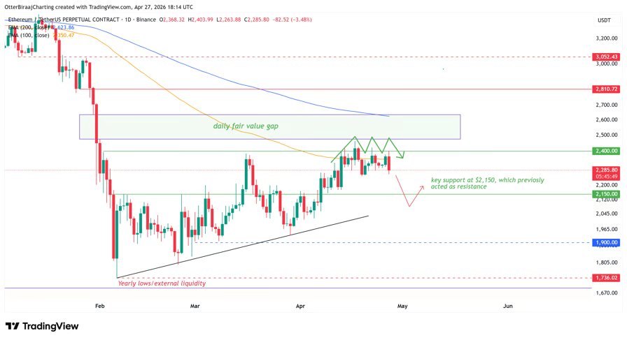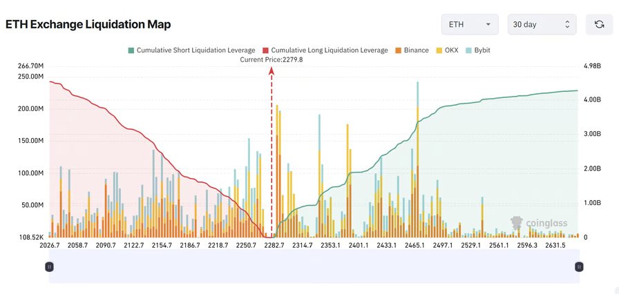 Ether (ETH) fell 3.4% to $2,287 on Monday, after its fourth rejection on the $2,400 stage since April 14. The worth continues to commerce under the 100-day transferring common, with over $2.5 billion in liquidation danger concentrated close to the $2,150 help zone.