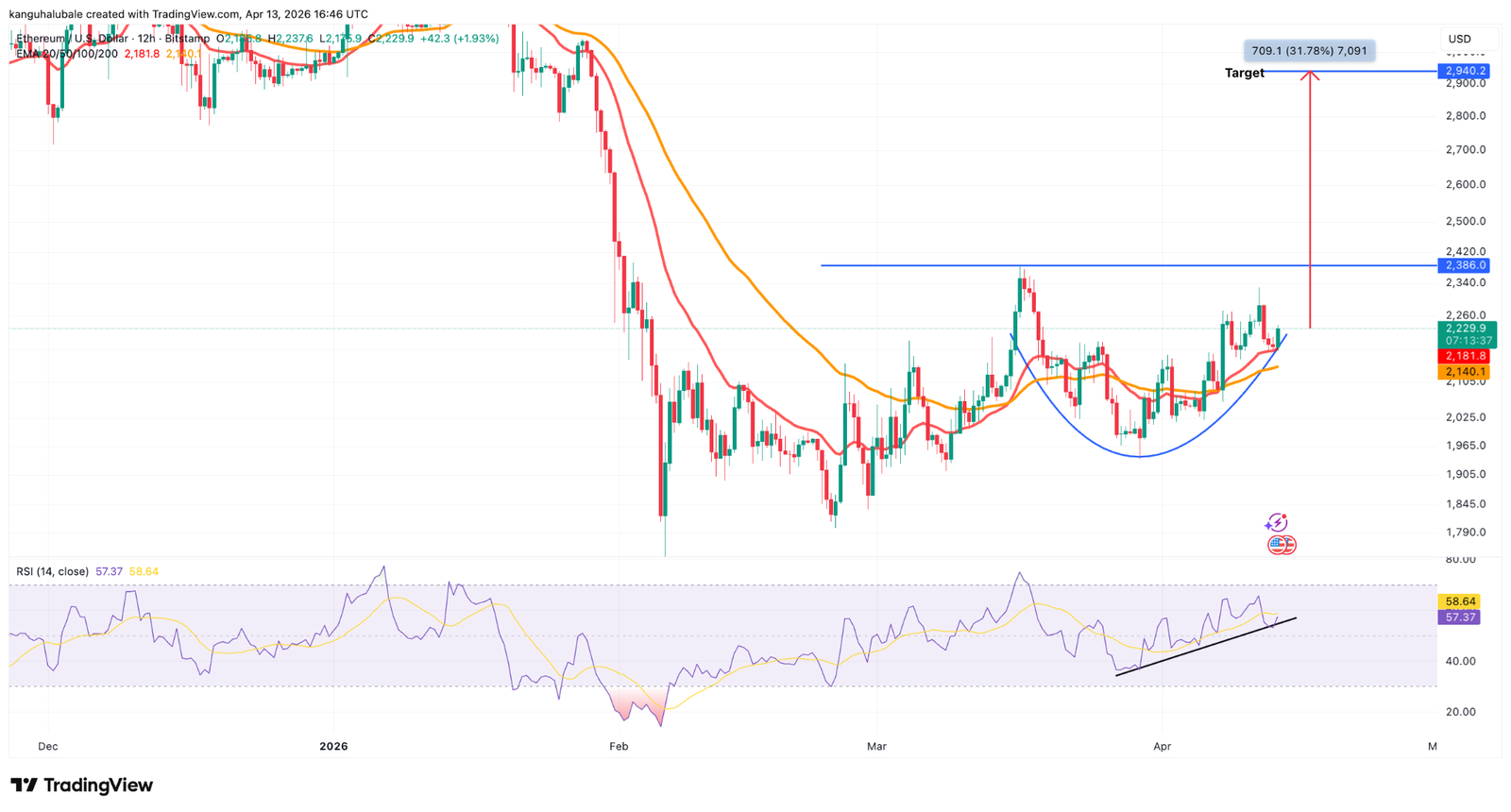 Ether’s worth motion has fashioned a rounded backside chart sample on the 12-hour chart. The value is retesting the $2,140 help, the place the chart’s help line and the 20-day exponential moving average (EMA) converge.