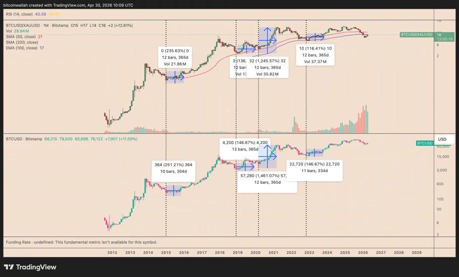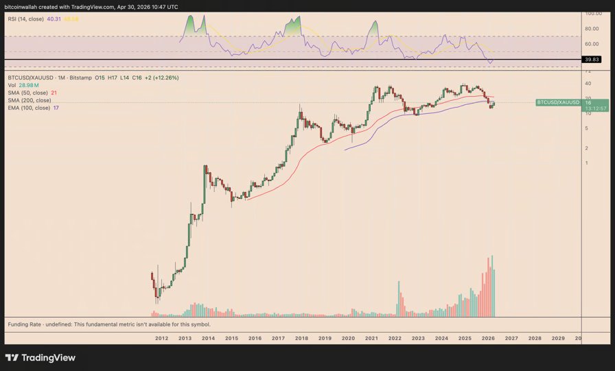 BTC/XAU stays beneath its 100-month exponential shifting common (100-month EMA, the purple line), a degree that beforehand marked main bottoms in March 2020 and December 2022.