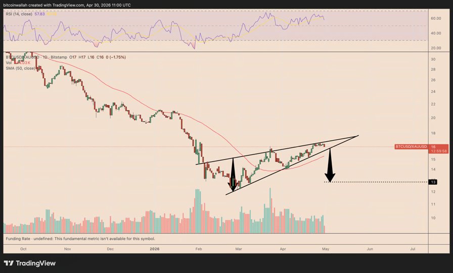 The bearish reversal setup factors to a possible 20% drop in Bitcoin’s gold-denominated worth, based mostly on the wedge’s measured transfer.