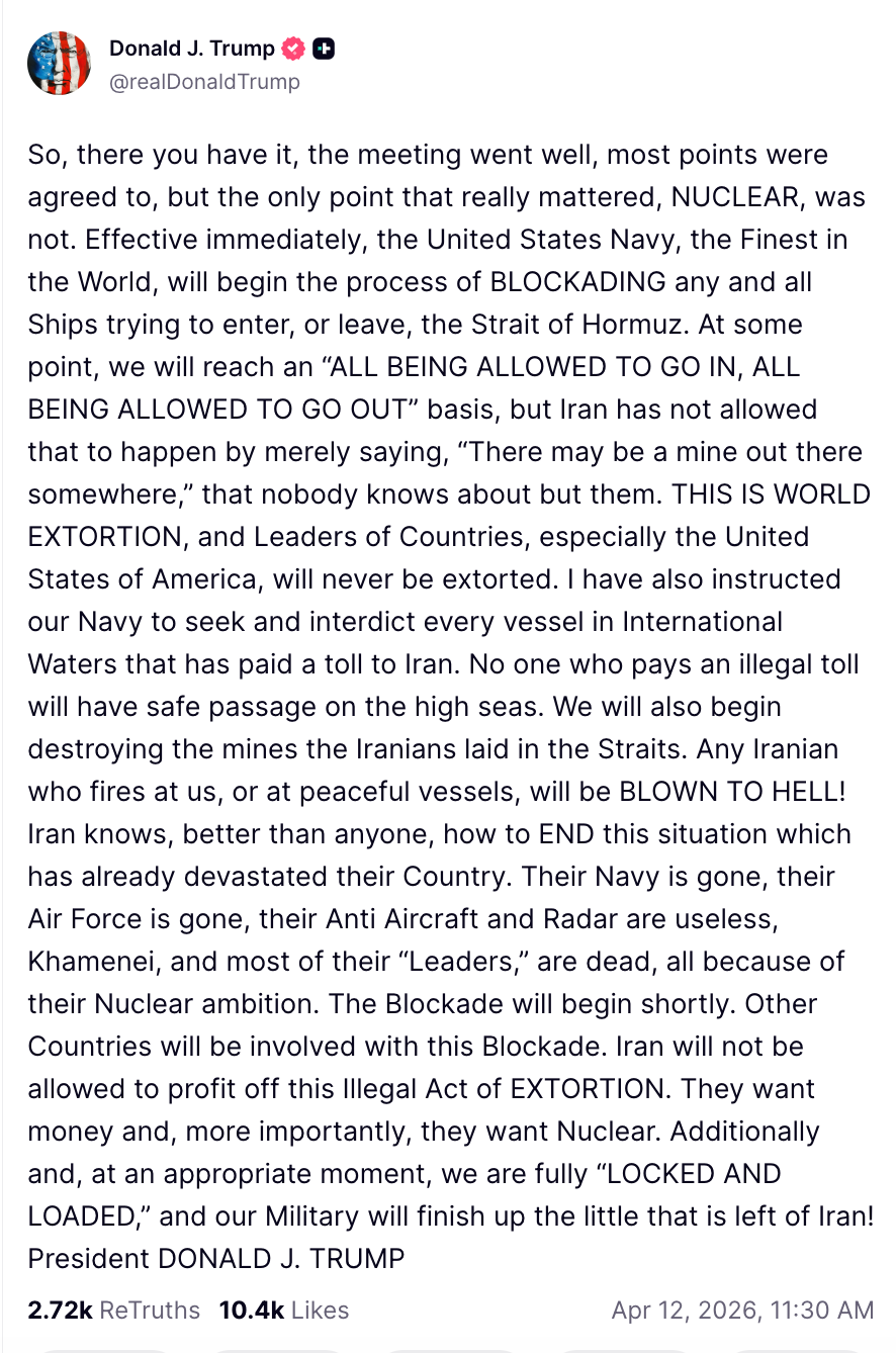Following the failed peace talks, US President Donald Trump said he directed the US army to type a naval blockade across the Strait of Hormuz.