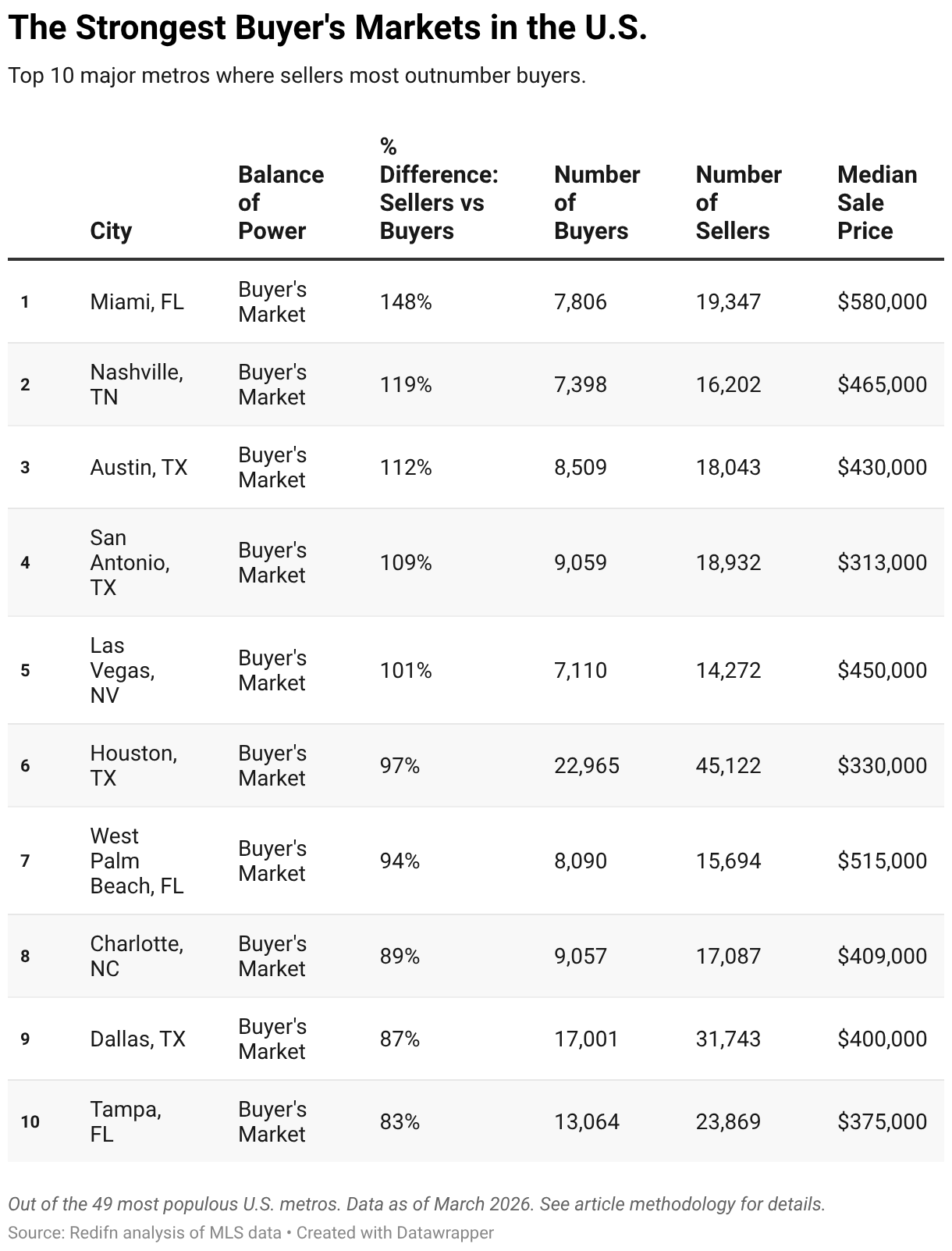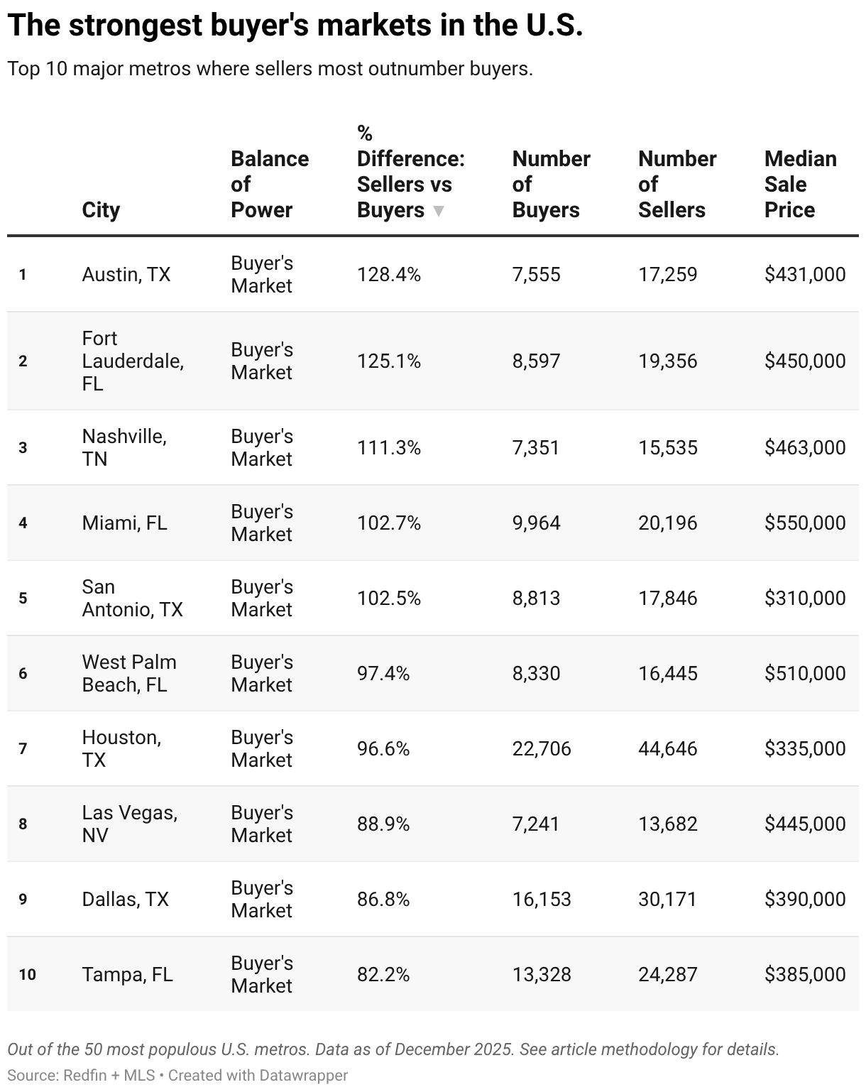 The Solar Belt—cities stretching from the Southeast to the Southwest—is dwelling to all the nation’s strongest purchaser’s markets. Miami sits firmly on high, whereas Austin is in third—floor zero for the cooldowns sweeping pandemic boomtowns since 2022.