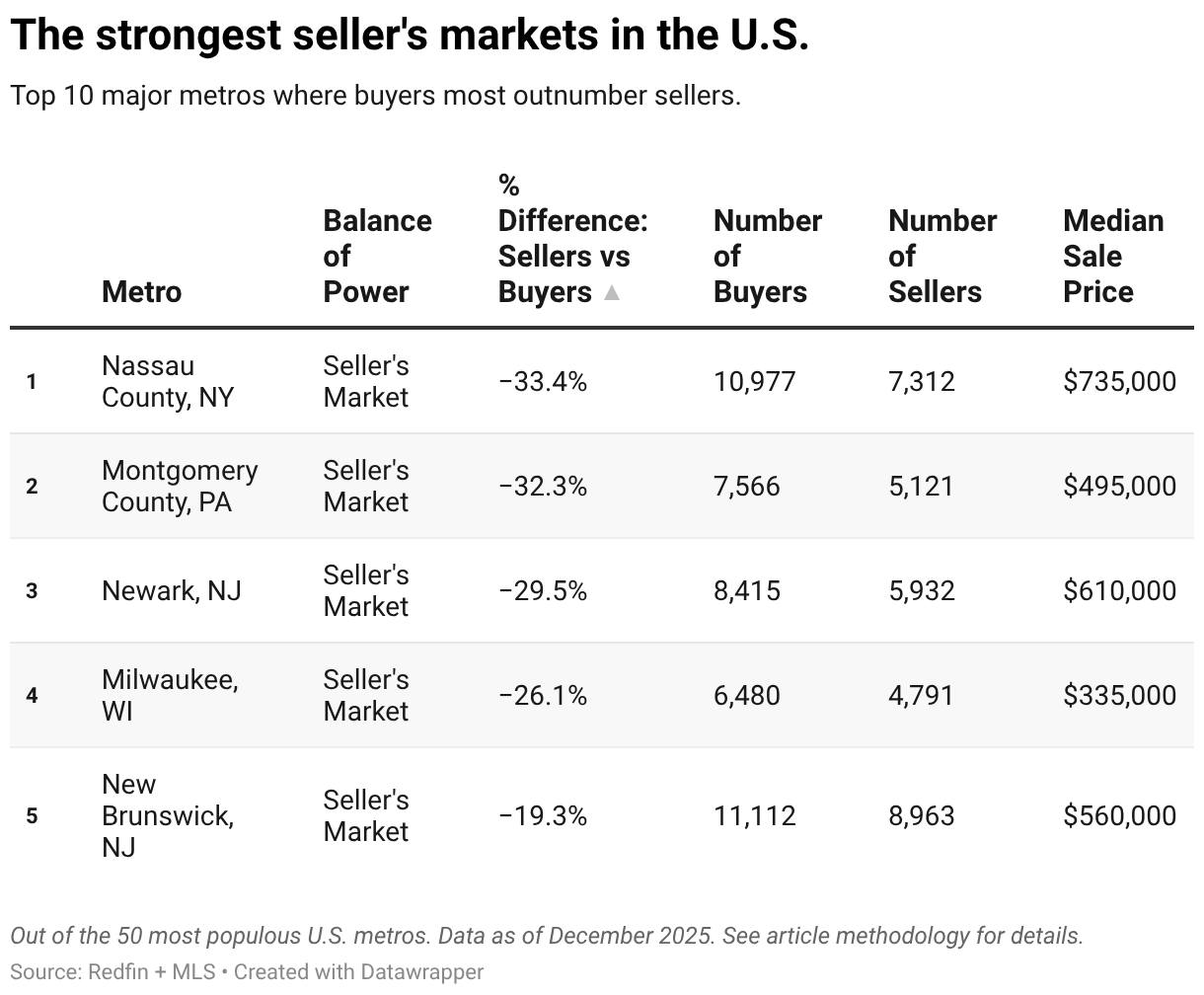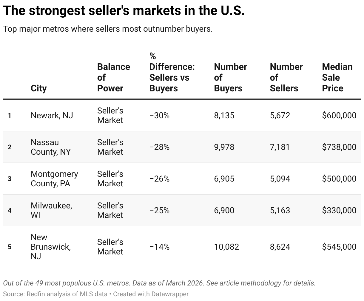 In a handful of metros, patrons nonetheless outnumber sellers, giving sellers the sting. Redfin outlined a vendor’s market as one the place the patrons outnumbered sellers by no less than 10%, and solely seven metros made the minimize.