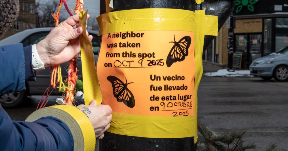 The group has additionally been working to put markers on websites the place folks have been taken into custody. The thought was partly impressed by Amsterdam’s Stolpersteine, small brass plates embedded within the sidewalks to mark the final recognized residences of individuals exterminated by the Nazis. The Chicago markers are flimsier and extra ephemeral — vivid ropes braided from scrap material and laminated orange building paper printed with butterflies and a message in English and Spanish: “A neighbor was taken from this spot on ____.”