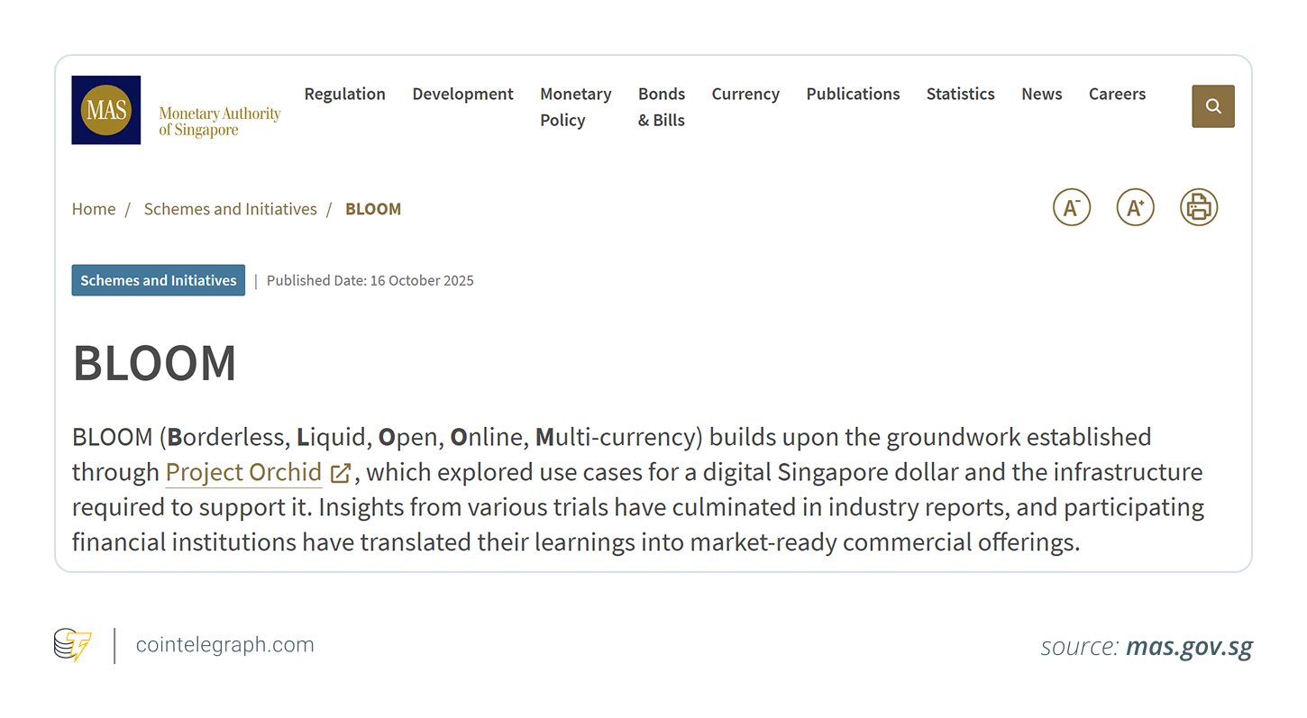 The MAS launched BLOOM in October 2025 to look at how tokenized cash might enhance settlement processes throughout borders and between establishments.