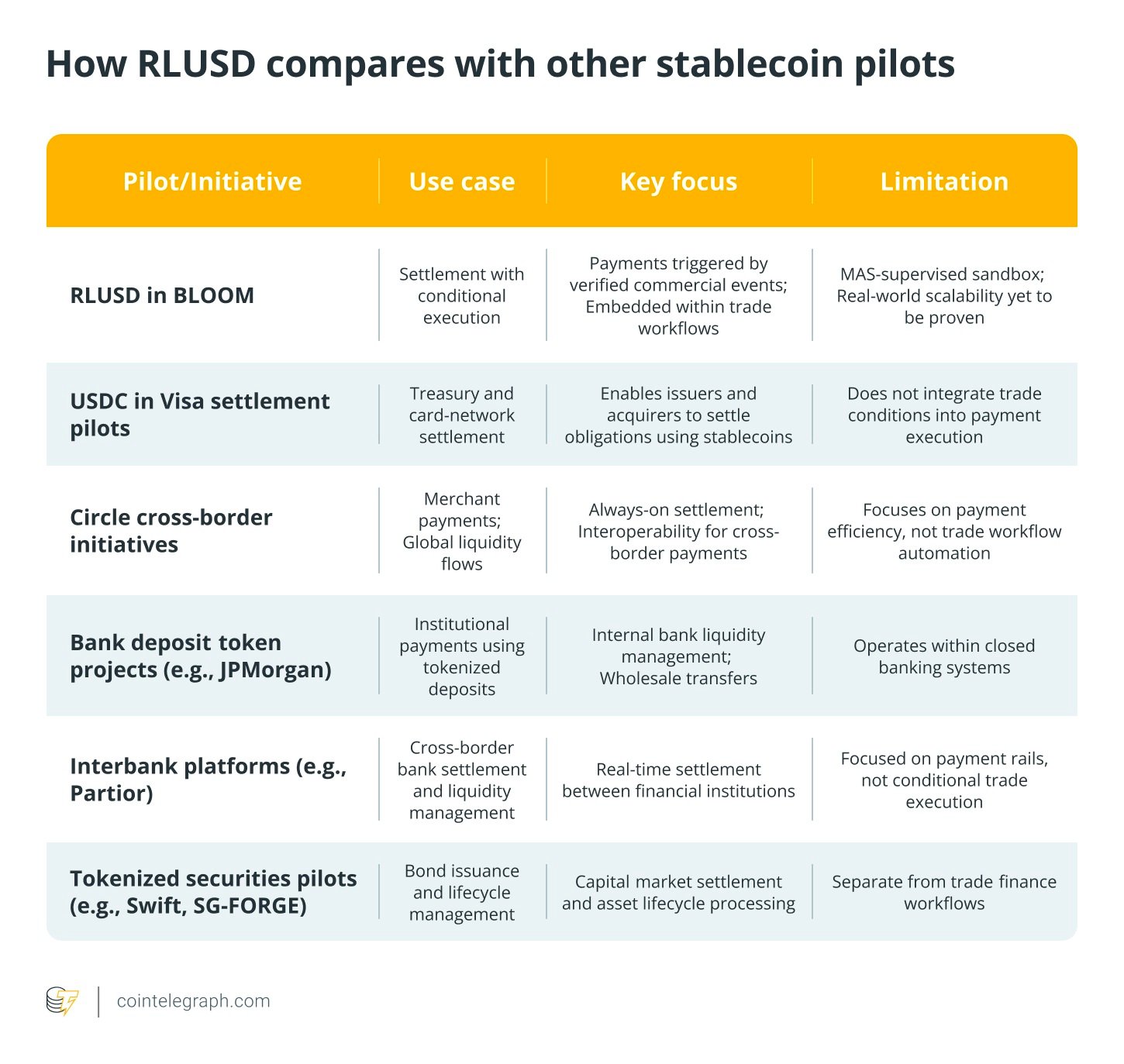 Multi-asset setting: RLUSD is being evaluated alongside tokenized financial institution liabilities. This aligns with MAS’ broader goal of making interoperable settlement belongings somewhat than counting on a single dominant mannequin.
