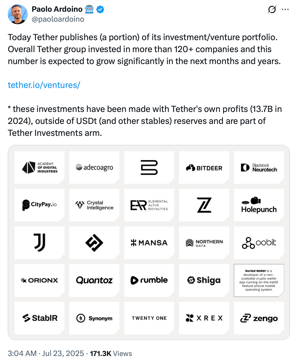 CEO Paolo Ardoino stated in July that Tether has invested in more than 120 companies via its enterprise arm, with these investments funded from firm income reasonably than stablecoin reserves.