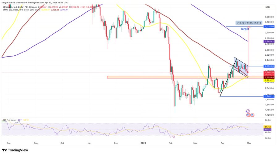 The flag will resolve as soon as the value breaks above the higher pattern line at $2,350 and will rise by as a lot because the earlier uptrend’s top. This locations the higher goal for ETH worth simply above $3,000, about 33.5% above the present worth.