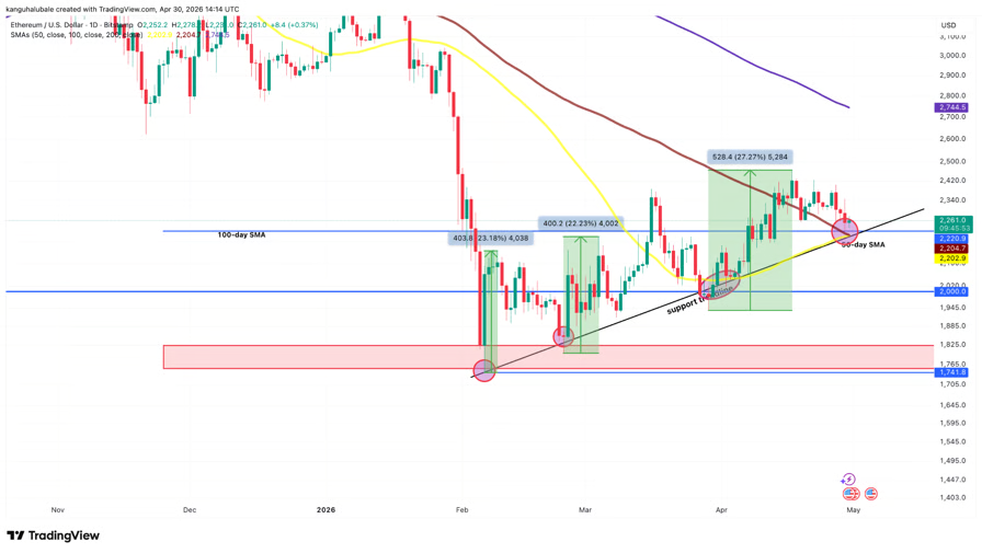 Ether is now consolidating close to the pattern line help round $2,000-$2,200, which additionally coincides with the 50-day (yellow wave) and 100-day SMAs (brown), a key dynamic help degree in ongoing uptrends.