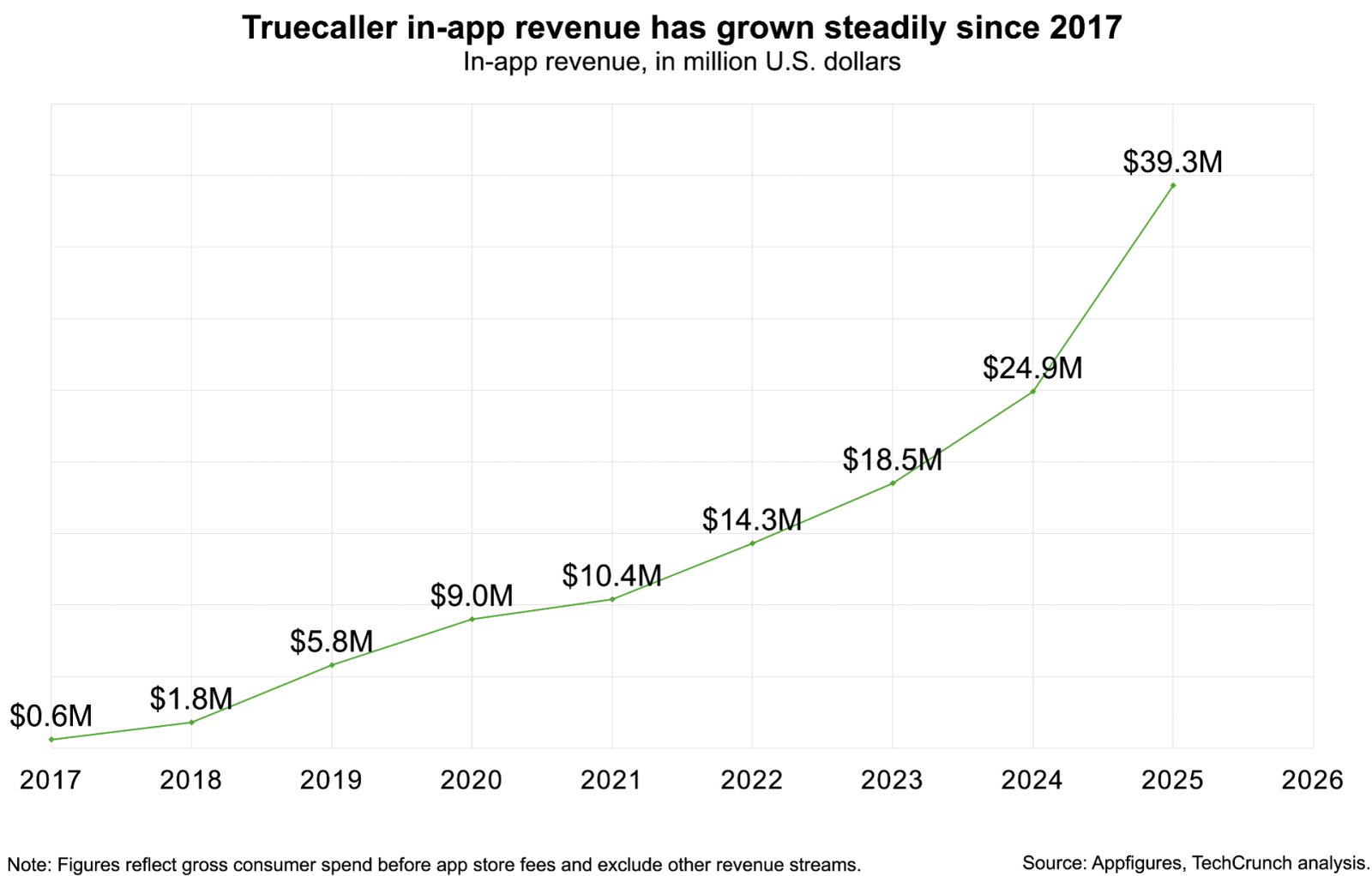 The strain on promoting comes at the same time as different elements of Truecaller’s enterprise are on a unique trajectory. Knowledge from Appfigures exhibits that whereas downloads have plateaued in recent times, gross in-app income has risen sharply — from $600,000 in 2017 to $39.3 million in 2025. It has already reached $13.4 million this yr as of April 20.