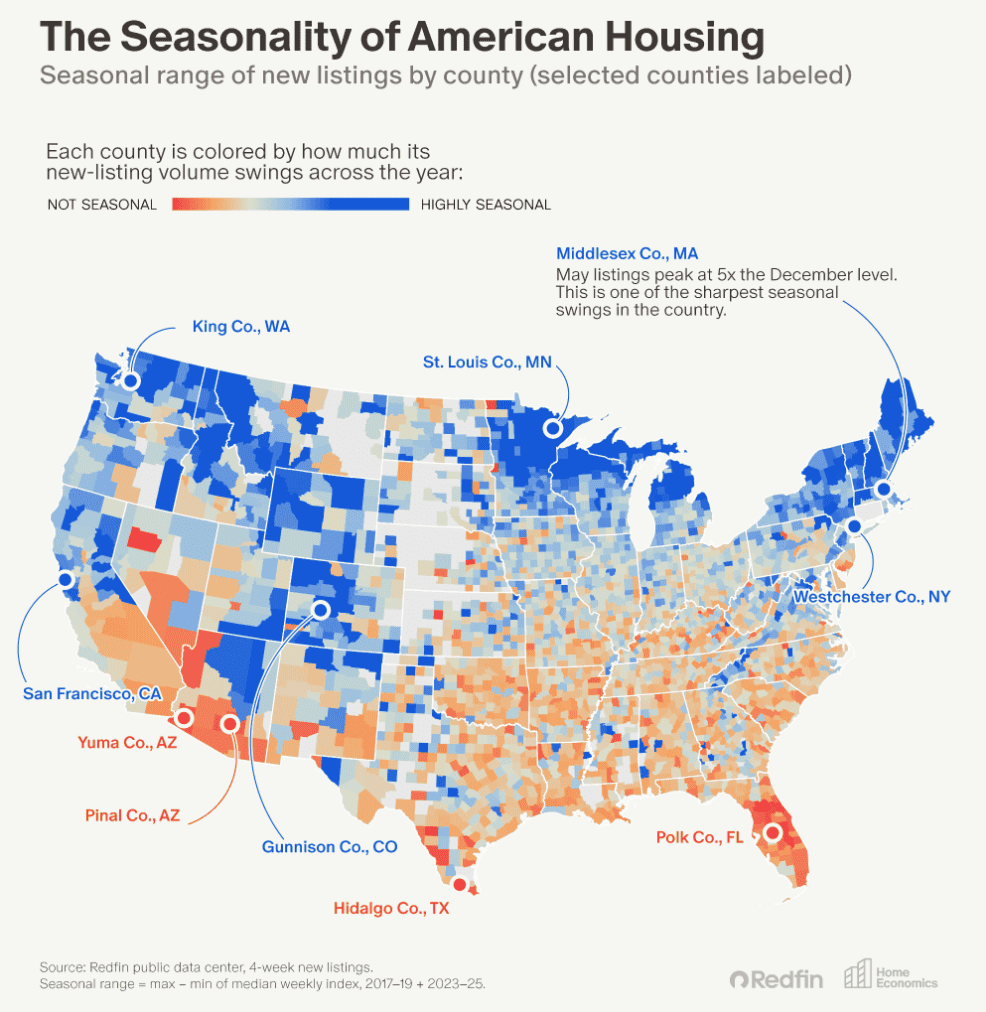 Seasonality additionally shifts by market, usually aligning with swings in housing provide. The timing and quantity of recent listings assist outline when a market heats up and cools down. The local weather performs a serious function in shaping these patterns: sometimes, the hotter a metropolis’s local weather, the much less seasonal it’s—i.e. the seasonal swing in listings is smaller.